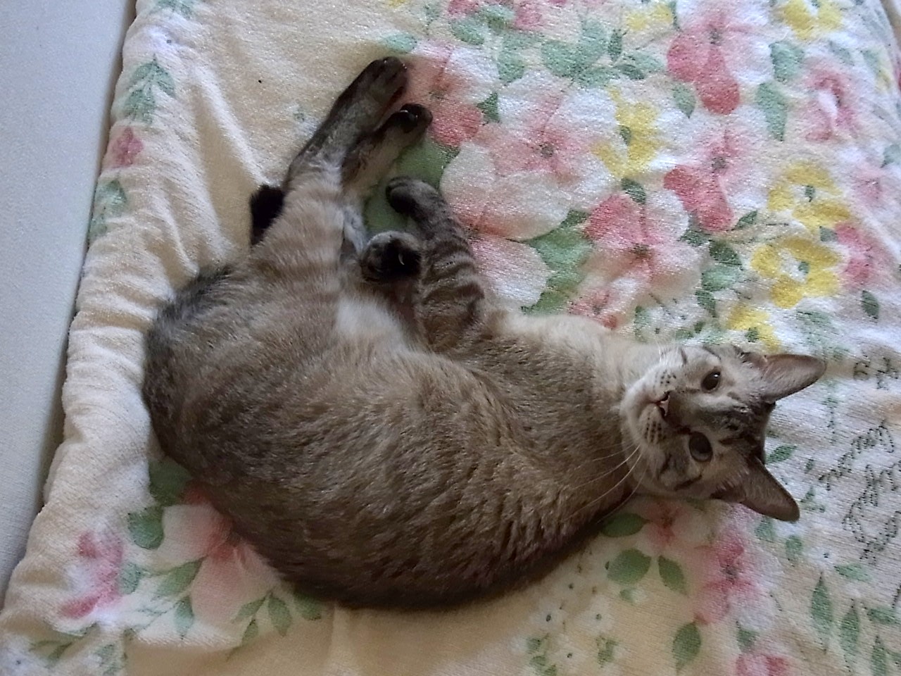 同じネコなのにノンは暑さに強い。花柄布団の上で涼しい顔してるが室温33℃。※前の記事は左の「社員猫の部屋」で読めます。