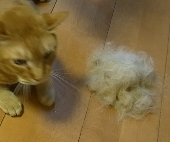 夏毛に変わる時期、ブラシをかけるとこんなに取れる。もったいないので、写真の抜け毛をぬるま湯の石けん水で丸めて、流水でよく洗い猫が遊ぶフェルトボールを作った。※前の記事は左の「社員猫の部屋」で読めます。
